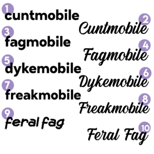 vinyl stickers made just for your car! they vary in size between 6″-13″. cuntmobile – ~10″ fagmobile – ~10″ dykemobile – ~11″ freakmobile – ~11″ feral fag – ~9″ danger: fag – ~10″ caution: queer – ~10″ honk if you’re queer – ~12″ ethically sourced homo – ~13″ queer menace – ~12″ oh baby yes,…
